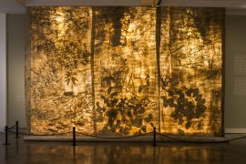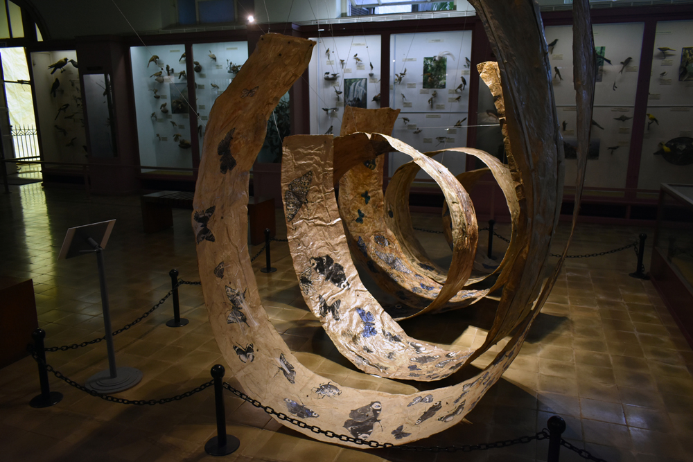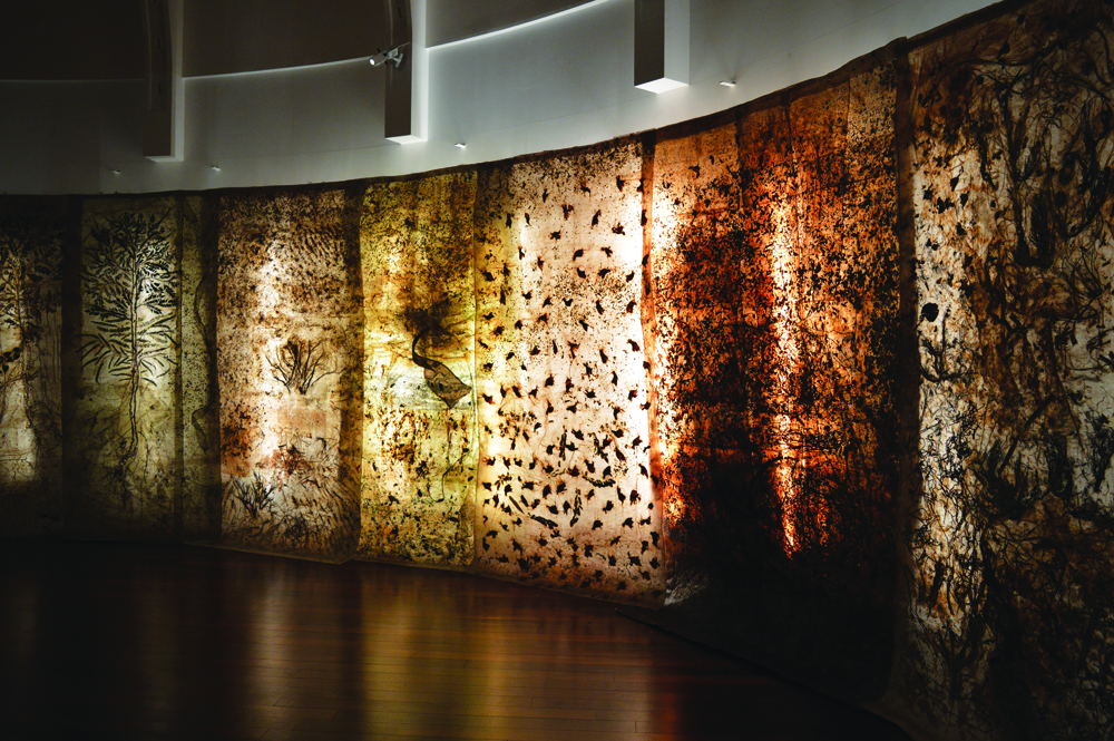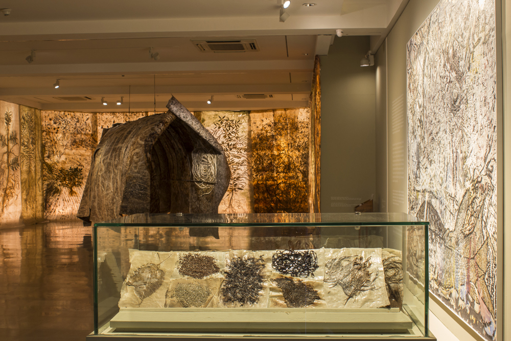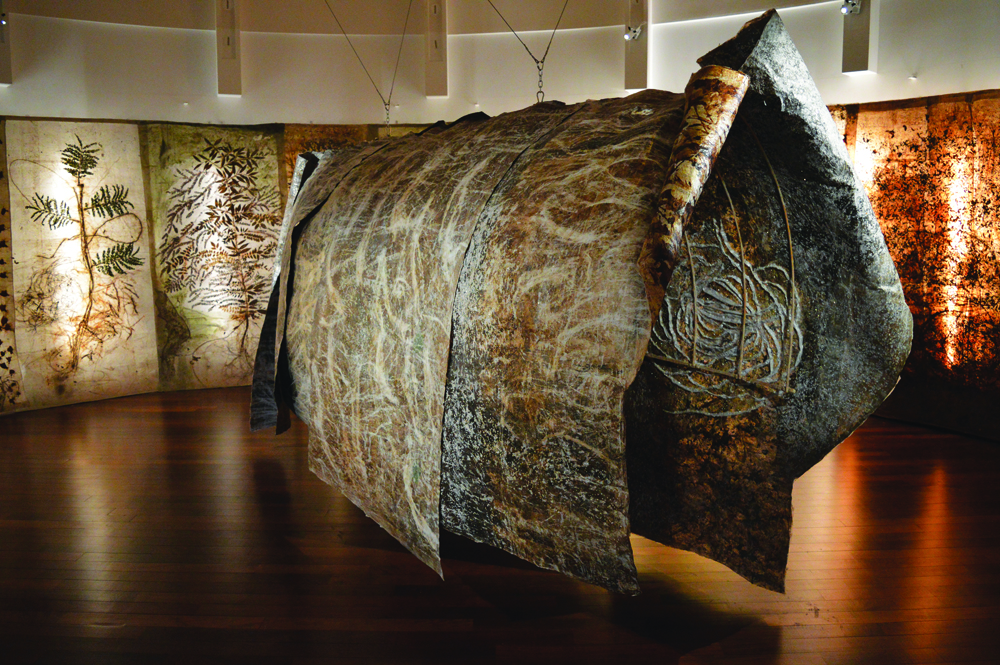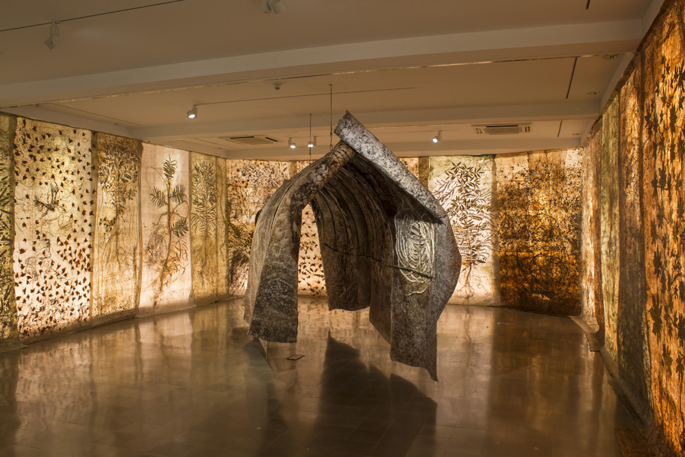 Nature for her ceases to be a ‘view of the landscape’ frozen in time but has always meant the extended holistic environment that can neither be captured nor comprehended from a single vantage point. Her soaring paper installations hence opt for a mobile vision that takes the viewer’s gaze along to glide over the surface of her unframed scrolls as well as penetrate the layers underneath.