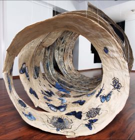 Over the last three decades or more, Jayashree Chakravarty’s art practice has addressed the exigent situation of shrinking natural habitat and water bodies in ever-expanding Indian cities. Living by herself in a rapidly urbanizing suburb of Kolkata in Eastern India, she has been a witness to the rich marshlands of Salt Lake transform into ‘Salt Lake City’ a sprawling suburban development, exemplary of congestive urbanism and a growing hostility towards the ecology of life. Her work then extrapolates this loss, reacting and reflecting upon a fast disappearing natural world. Nature no longer is a force independent of human impact and control. Jayashree reminds us that the earth is continuously being pushed towards a precarious edge, where the threat of daily damage has taken on precipitous dimensions. Through poetic evocations, she weaves into her personal vision the need for environmental healing and resurrection.